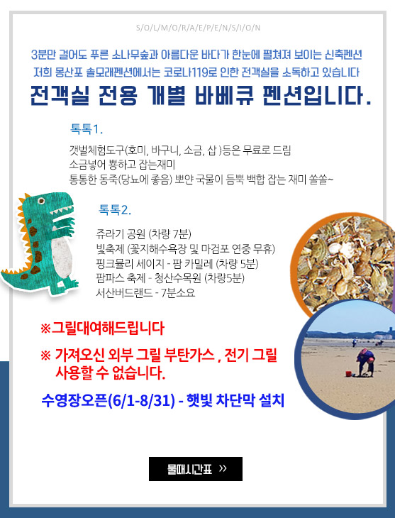 계좌 : 010-9410-513619(농협/가태임) l 주소 : 충남 태안군 남면 달산포로 161-12 l 상호 : 몽산포 솔모래펜션 l 대표 : 가태임